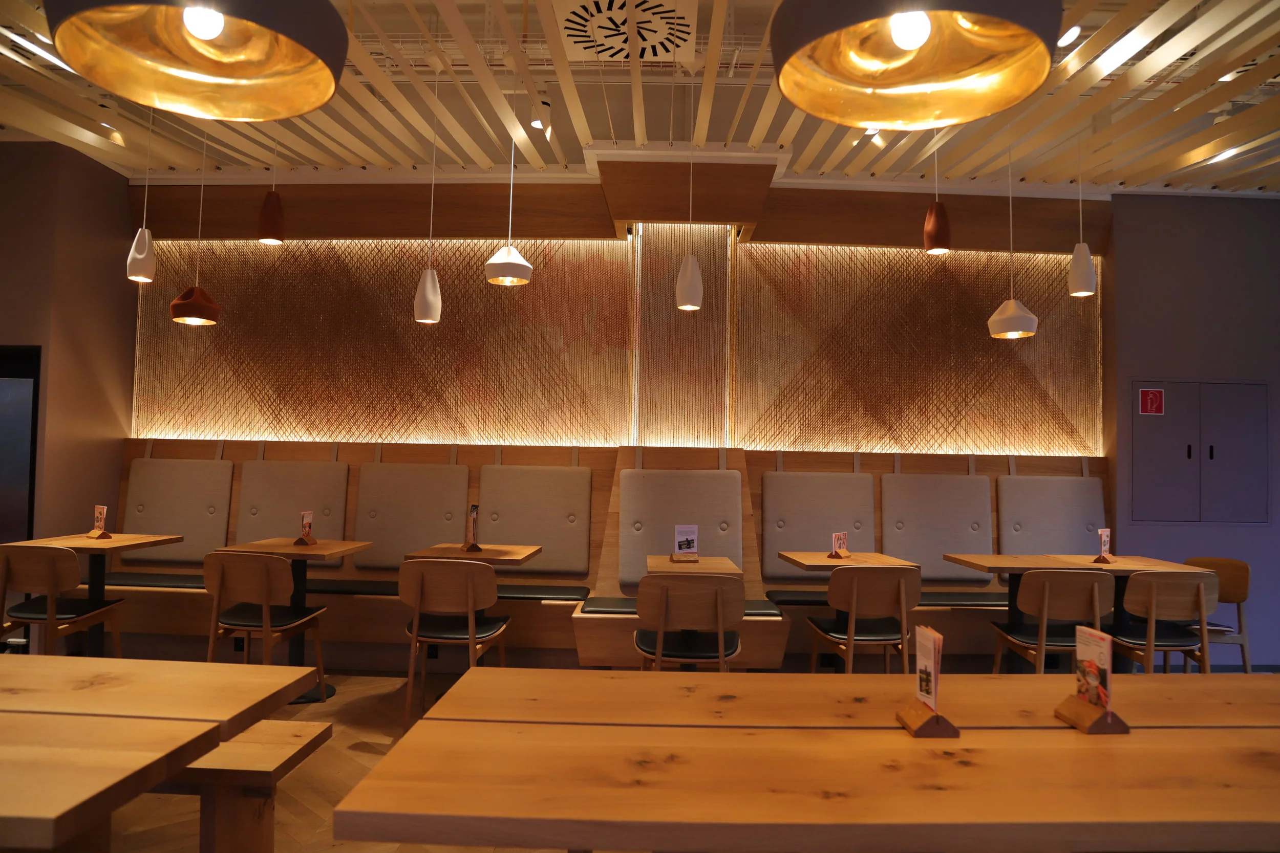 Als Blickfang hinter einer langen Sitzbank wurde Kokosschnur vor eine Tapete gespannt.